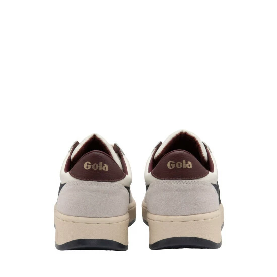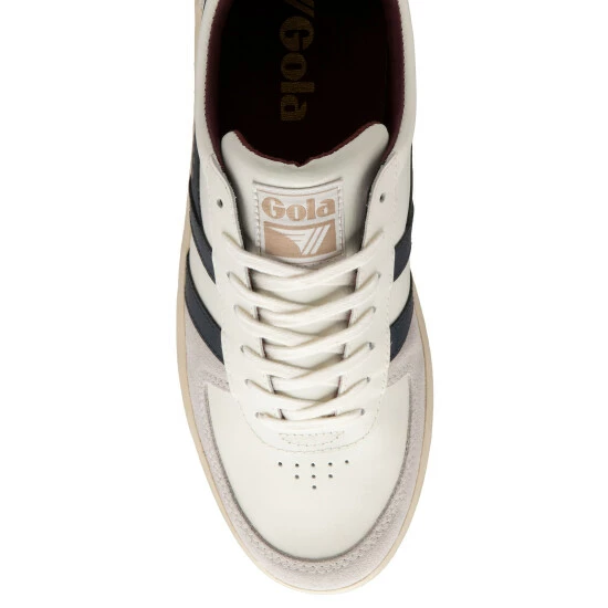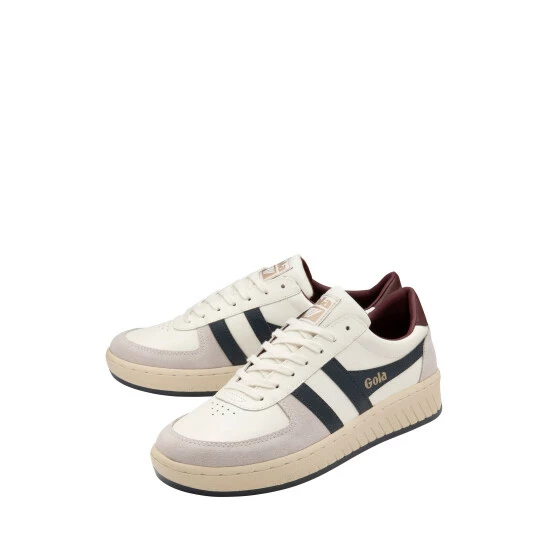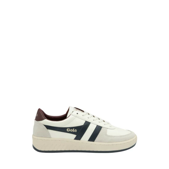 Grandslam Classic for men gets a subtle style elevation this season with the addition of contrasting Gola wingflash and heel tab colour pops. The white leather trainer is finished with gold Gola branding call outs.