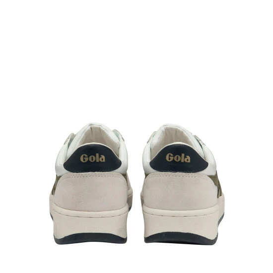 Grandslam Classic for men gets a subtle style elevation this season with the addition of contrasting Gola wingflash and heel tab colour pops. The white leather trainer is finished with gold Gola branding call outs.